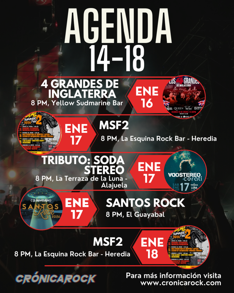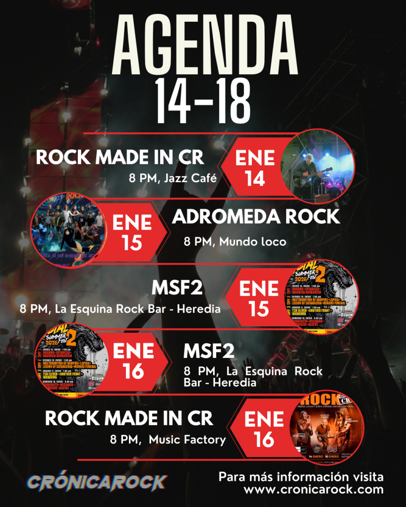 La agenda de conciertos de la semana llega cargada de rock, metal, indie y propuestas alternativas para iniciar el año como se debe. En Crónica Rock recopilamos los shows más destacados, tanto de la escena local como internacional, para que planifiques tus salidas, apoyes la música en vivo y no te perdás ningún concierto imperdible.