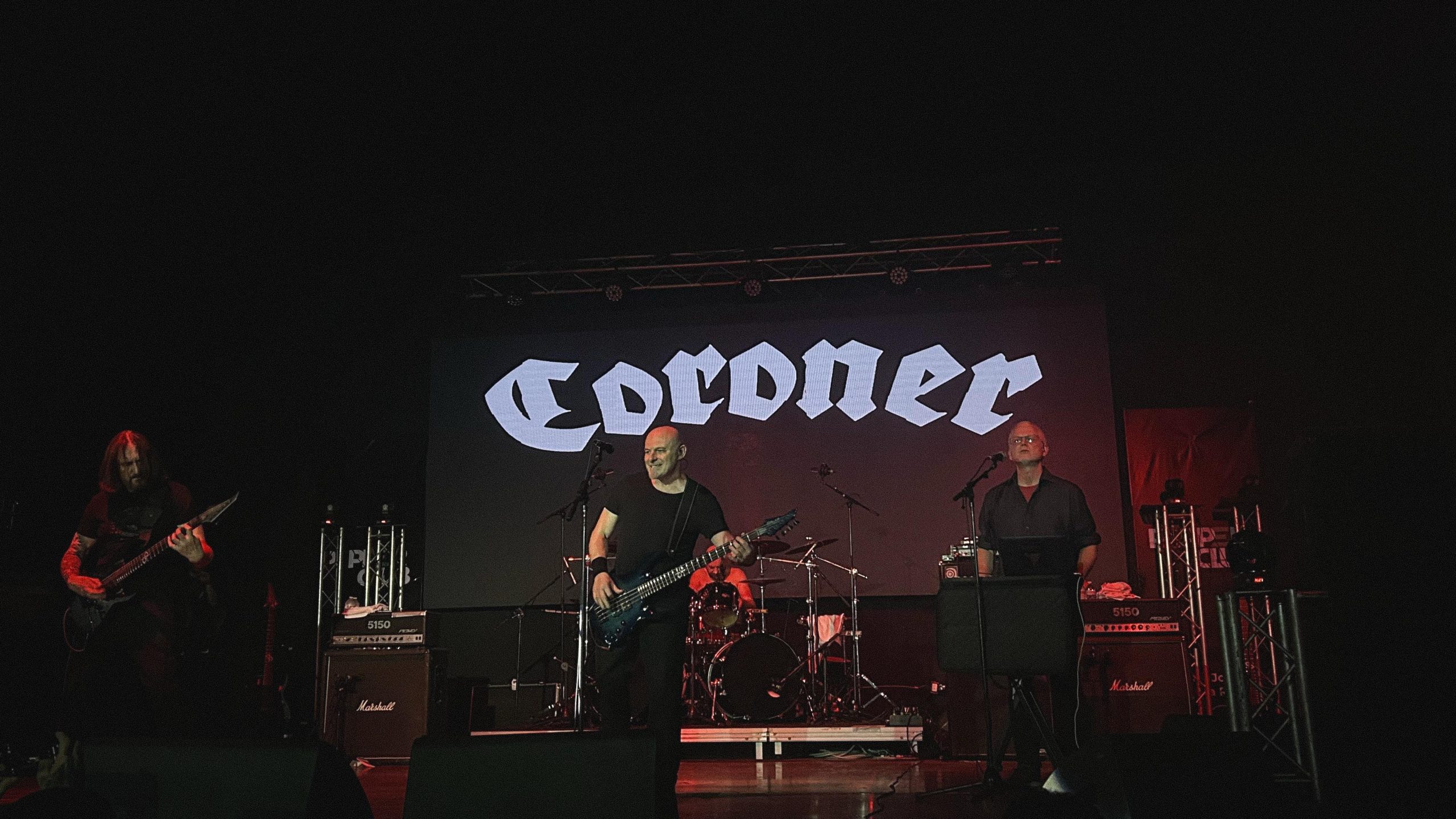 Llegó el momento más esperado de la noche, la presentación de los suizos Coroner, en su primera visita a Costa Rica. La banda, conocida por su mezcla de thrash técnico y pizcas de progresivo, no defraudó y brindó un show impecable, con un sonido potente y claro que resaltó la precisión de sus ejecuciones. Desde los primeros acordes, los cientos de fanáticos quedaron hipnotizadados por la maestría de cada miembro, especialmente la destreza en la guitarra de Tommy Vetterli, cuyas complejas estructuras y solos envolvieron el Pepper Club en una atmósfera electrizante. Canciones como «Masked Jackal», «Semtex Revolution» y «Reborn Through Hate» fueron algunos de los momentos más intensos del concierto, y con el público completamente entregado desde el inicio.